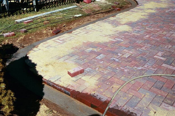 After the pavers are set, the edges are marked for cutting. This method ensures perfect free-flowing curves and prepares us for the next step.
